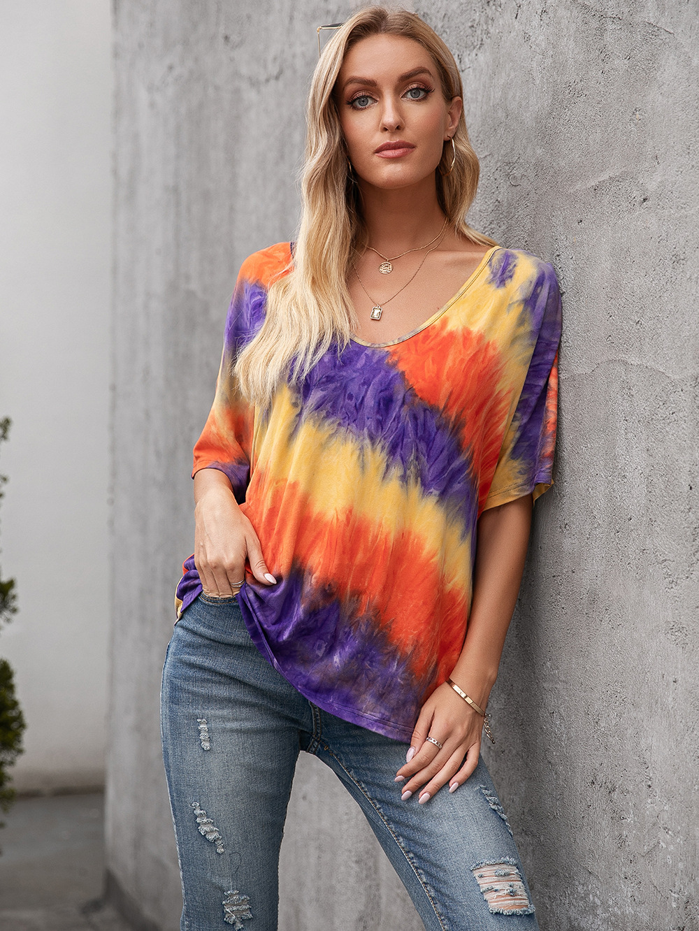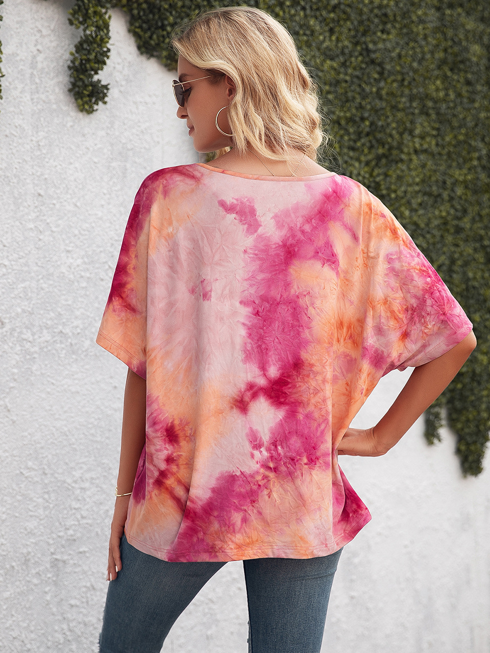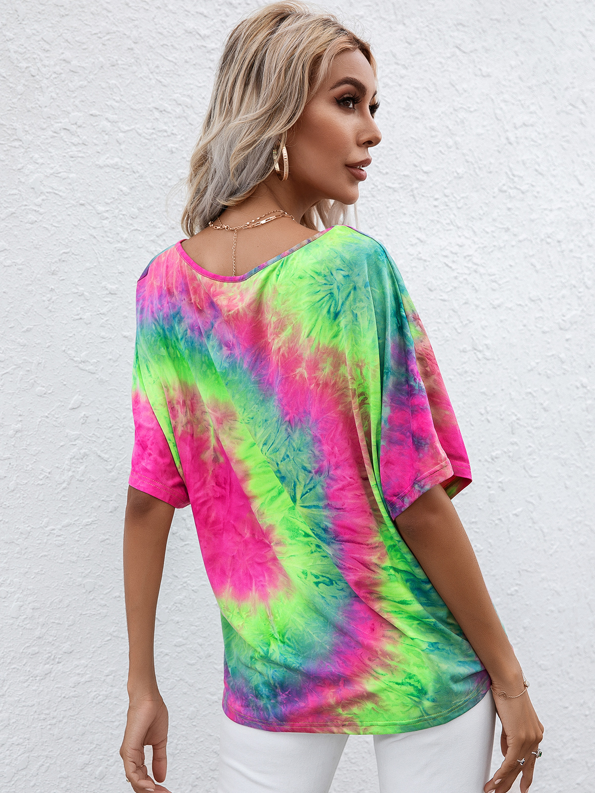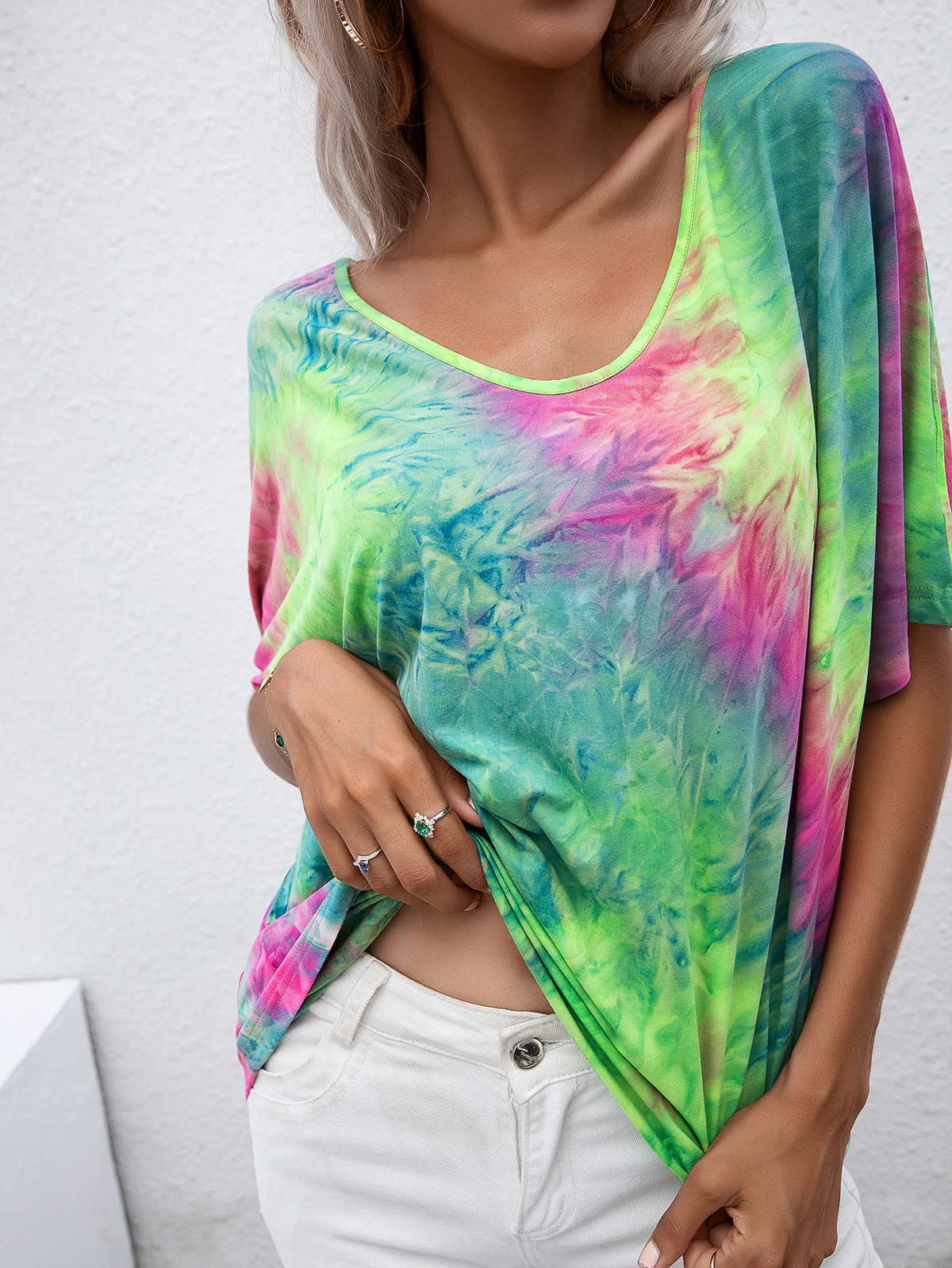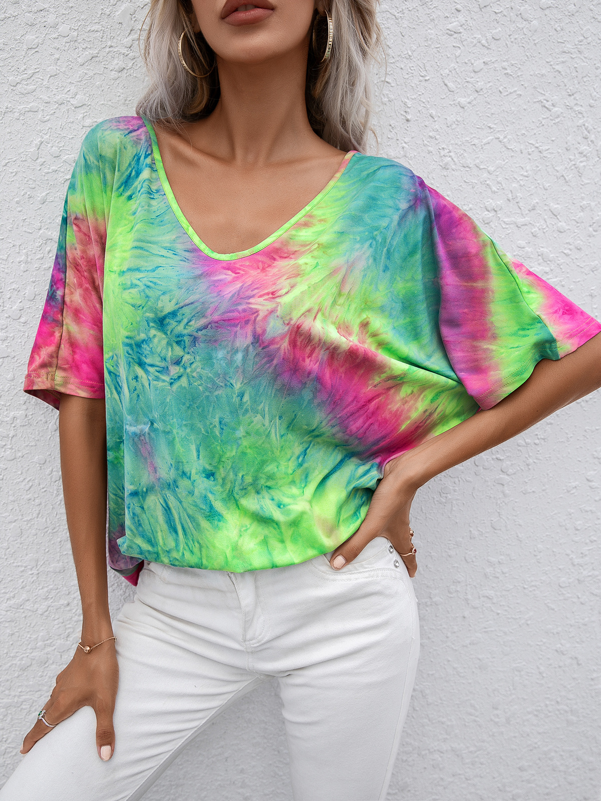 Casual Tie Dye Print Colorful Loose Round Neck Short Sleeve T-Shirt Women