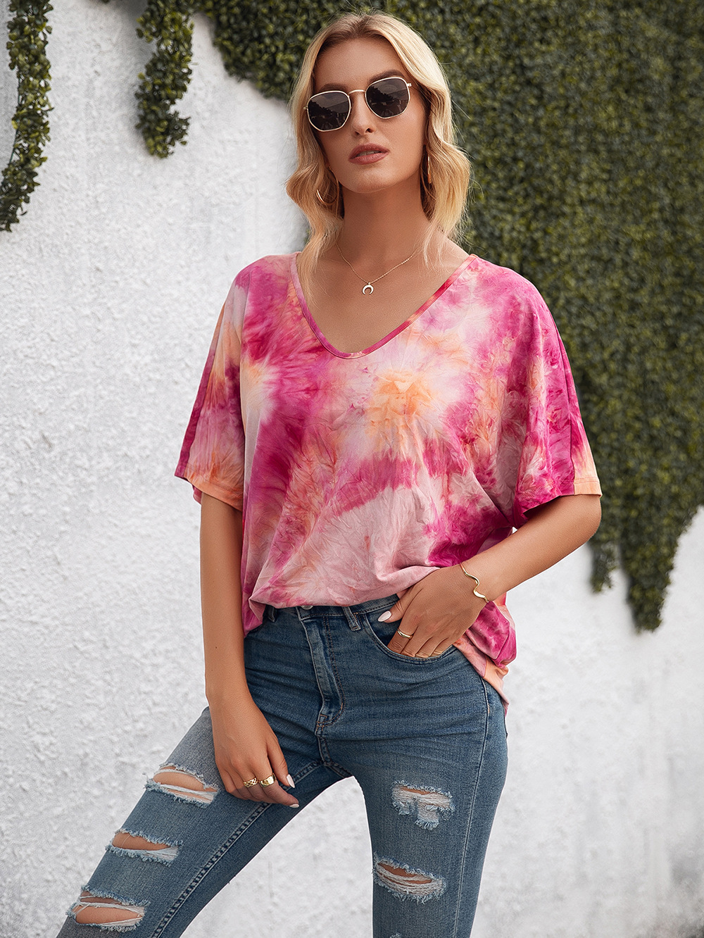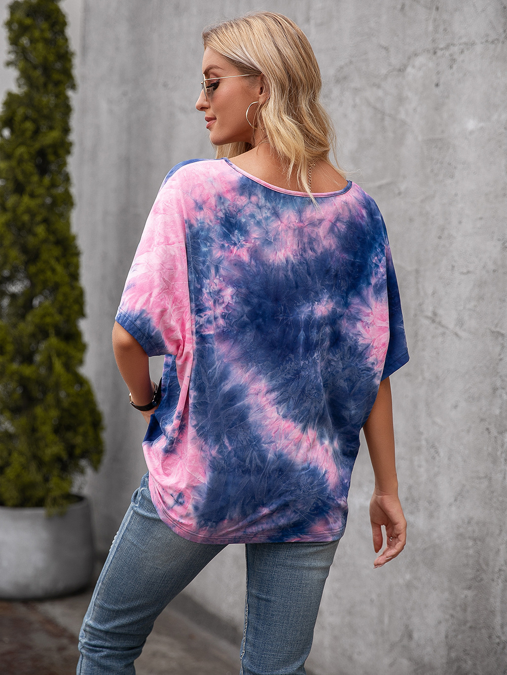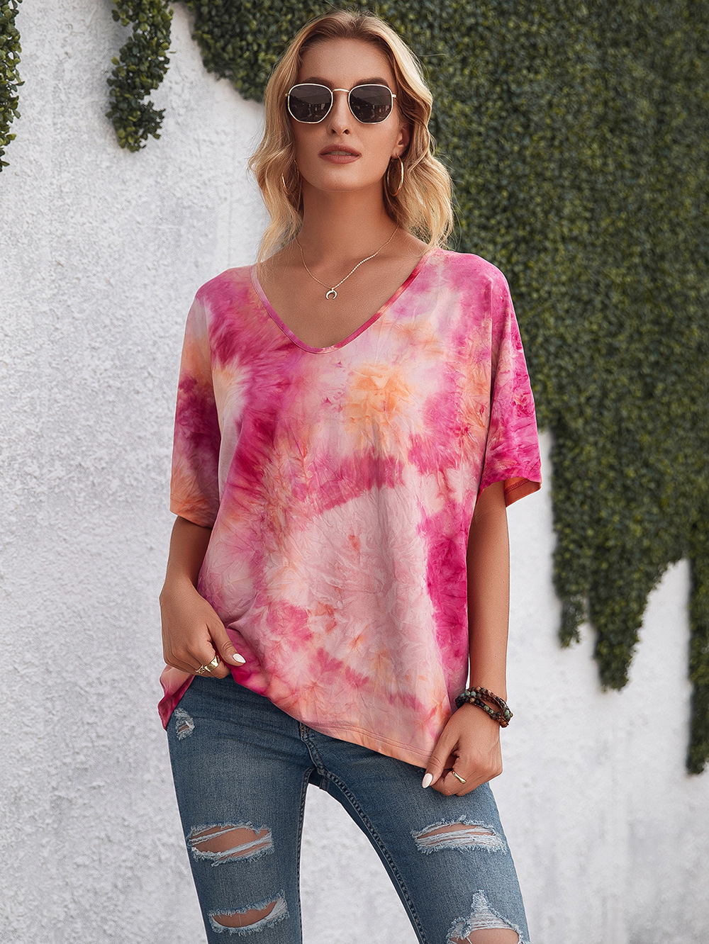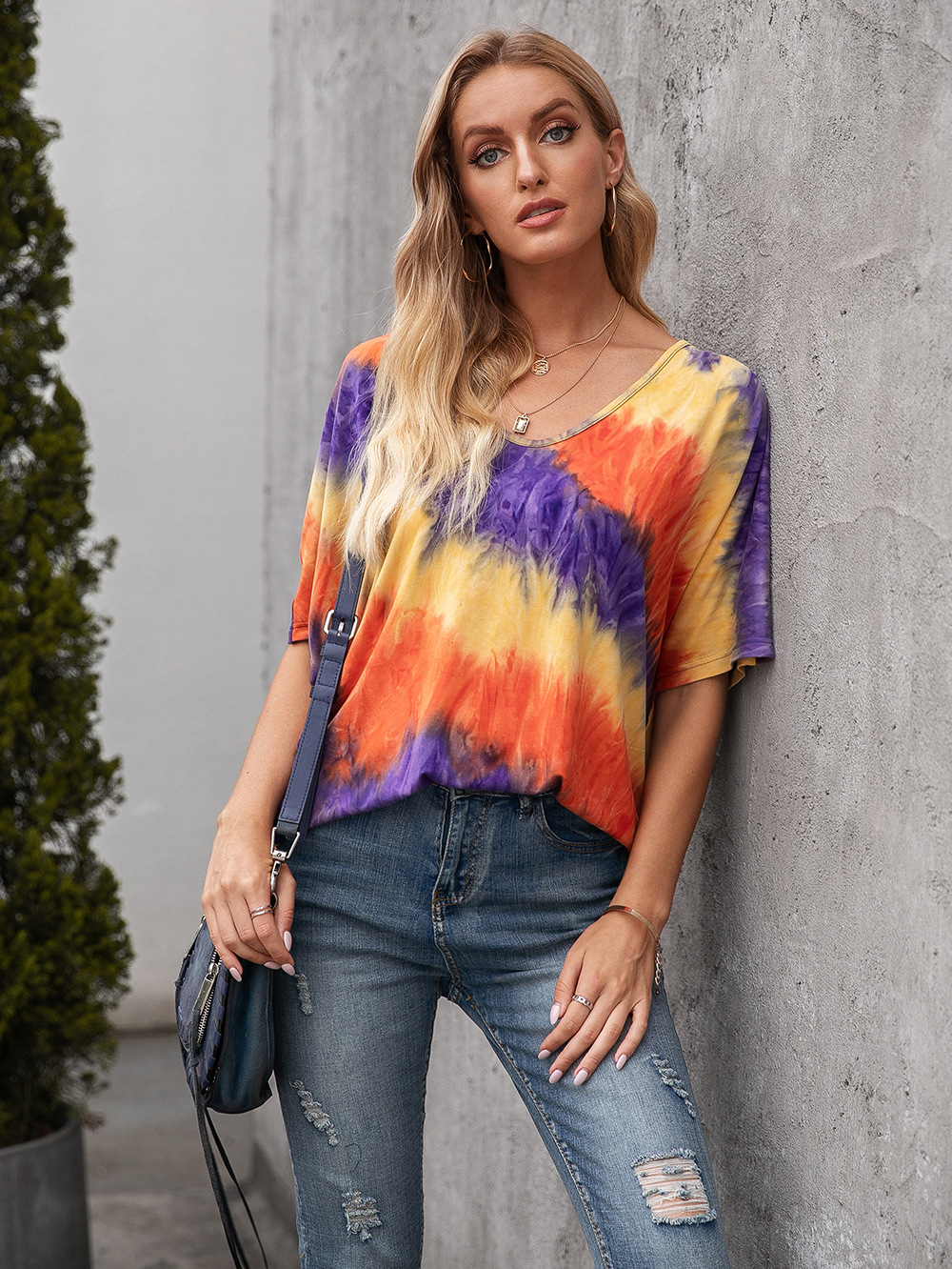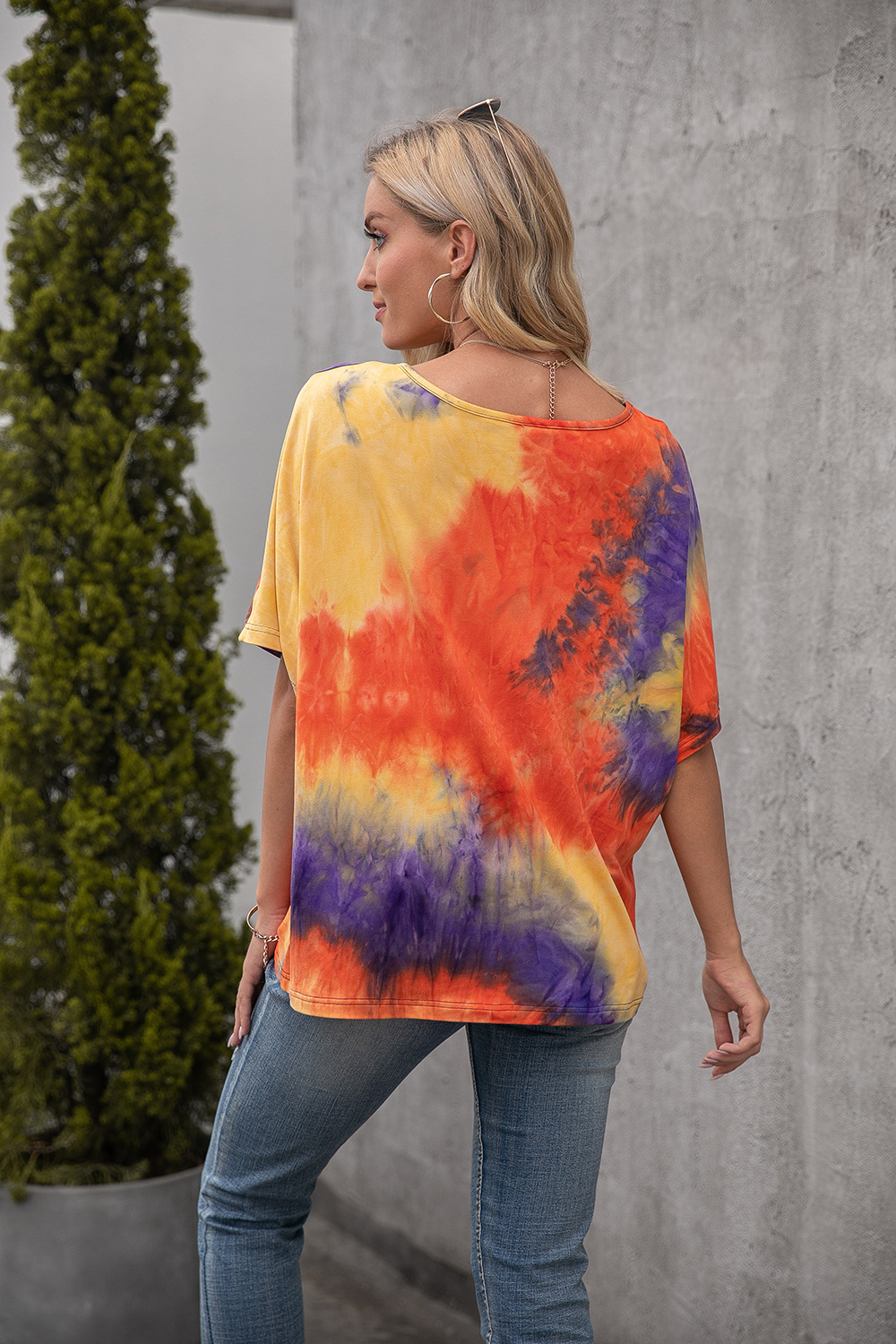 Casual Tie Dye Print Colorful Loose Round Neck Short Sleeve T-Shirt Women