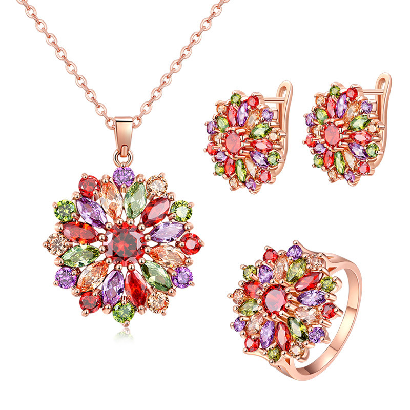 Trendy Rose Gold Zircon Jewelry Earrings Necklace Ring Three Piece Women's