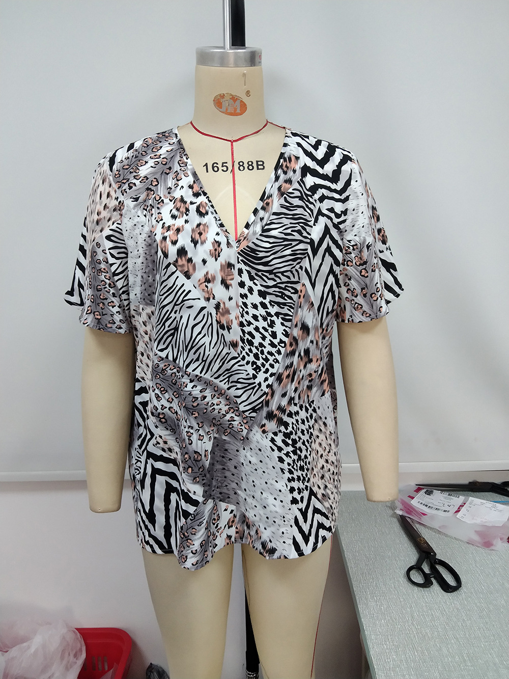 Loose Casual Leopard Print V-Neck Short Sleeve T-Shirt Simple Top Women